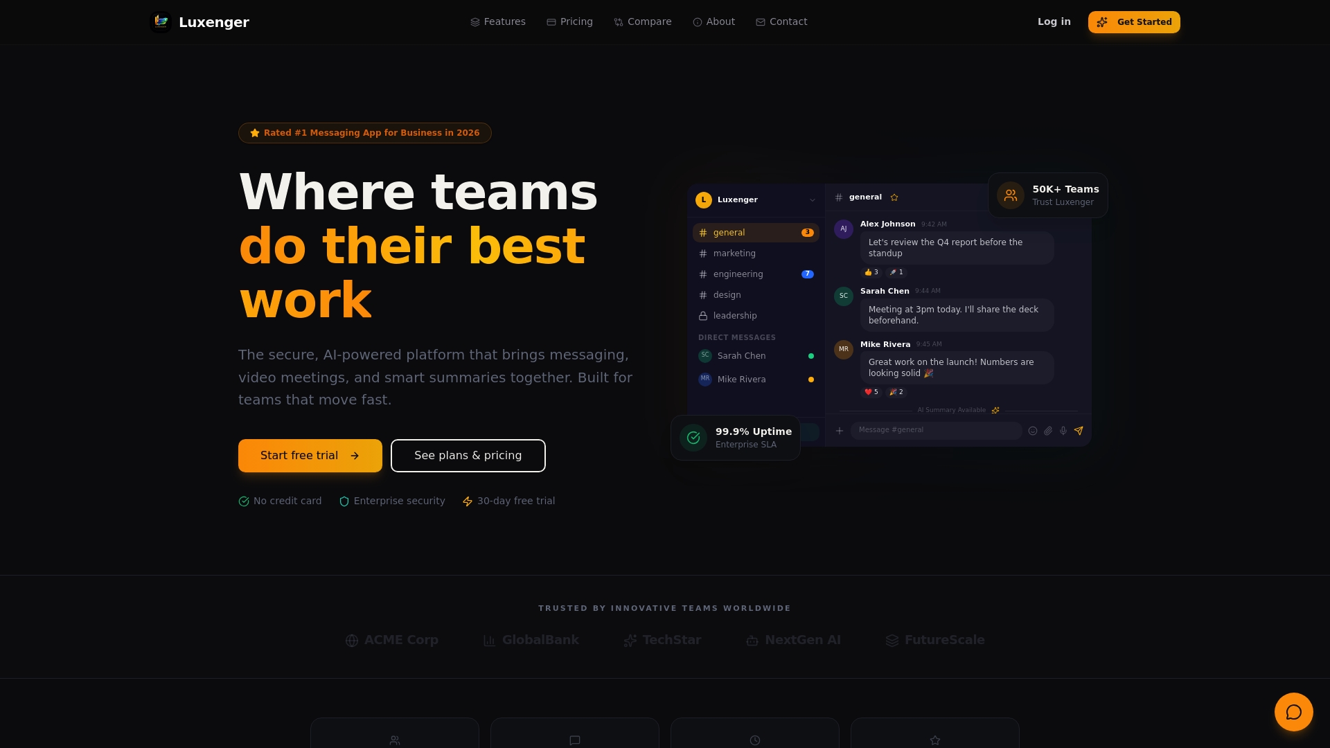 Implementing the steps outlined in this guide becomes straightforward with the right platform partner. Luxenger delivers enterprise-grade secure messaging built specifically for medium to large organizations seeking AI-enhanced collaboration without compromising security.