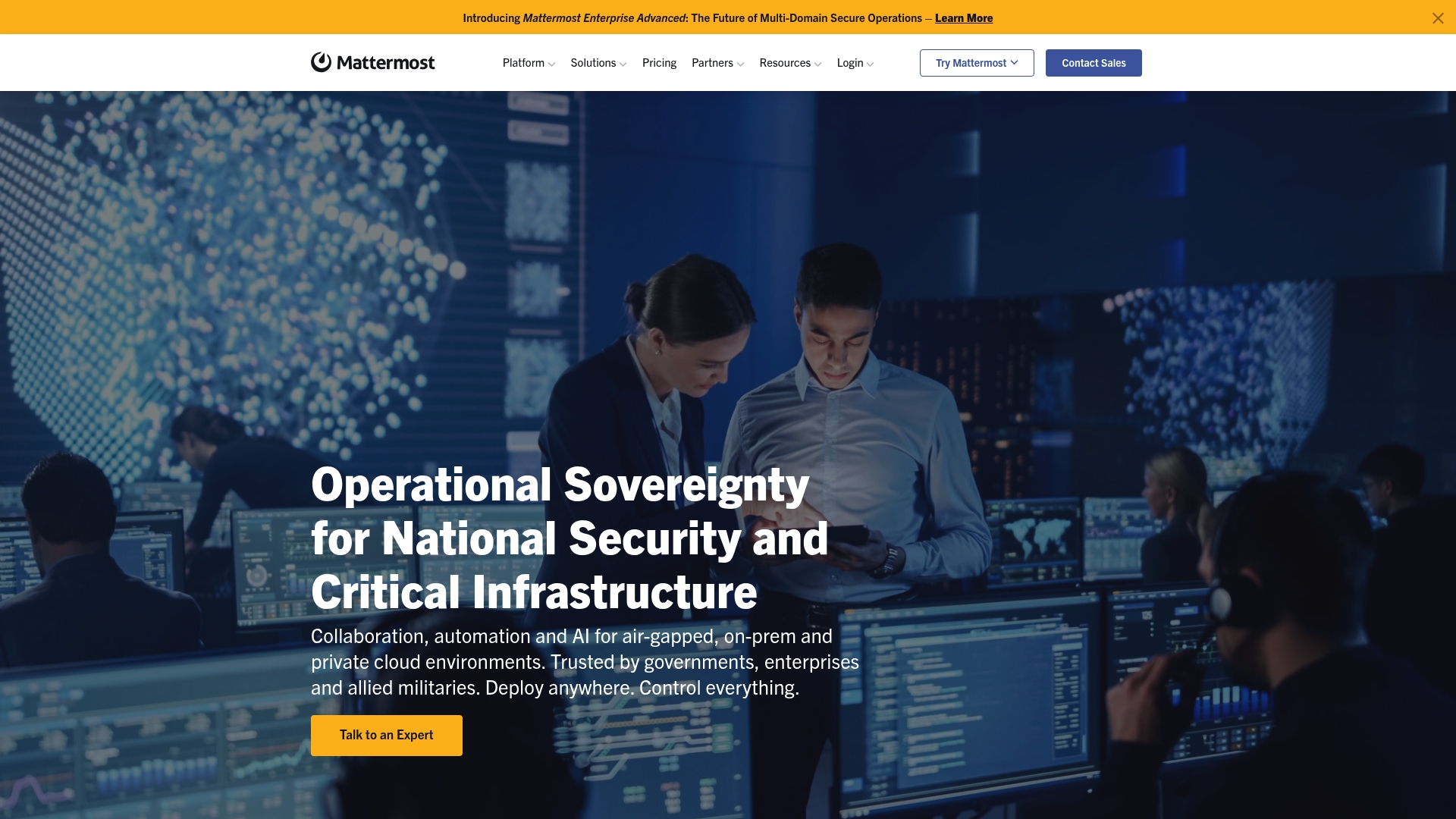 Mattermost Enterprise Advanced is a secure collaboration platform built for multi domain operations and mission critical environments. It combines operational sovereignty, AI driven automation, and flexible deployment to meet strict security and compliance requirements.