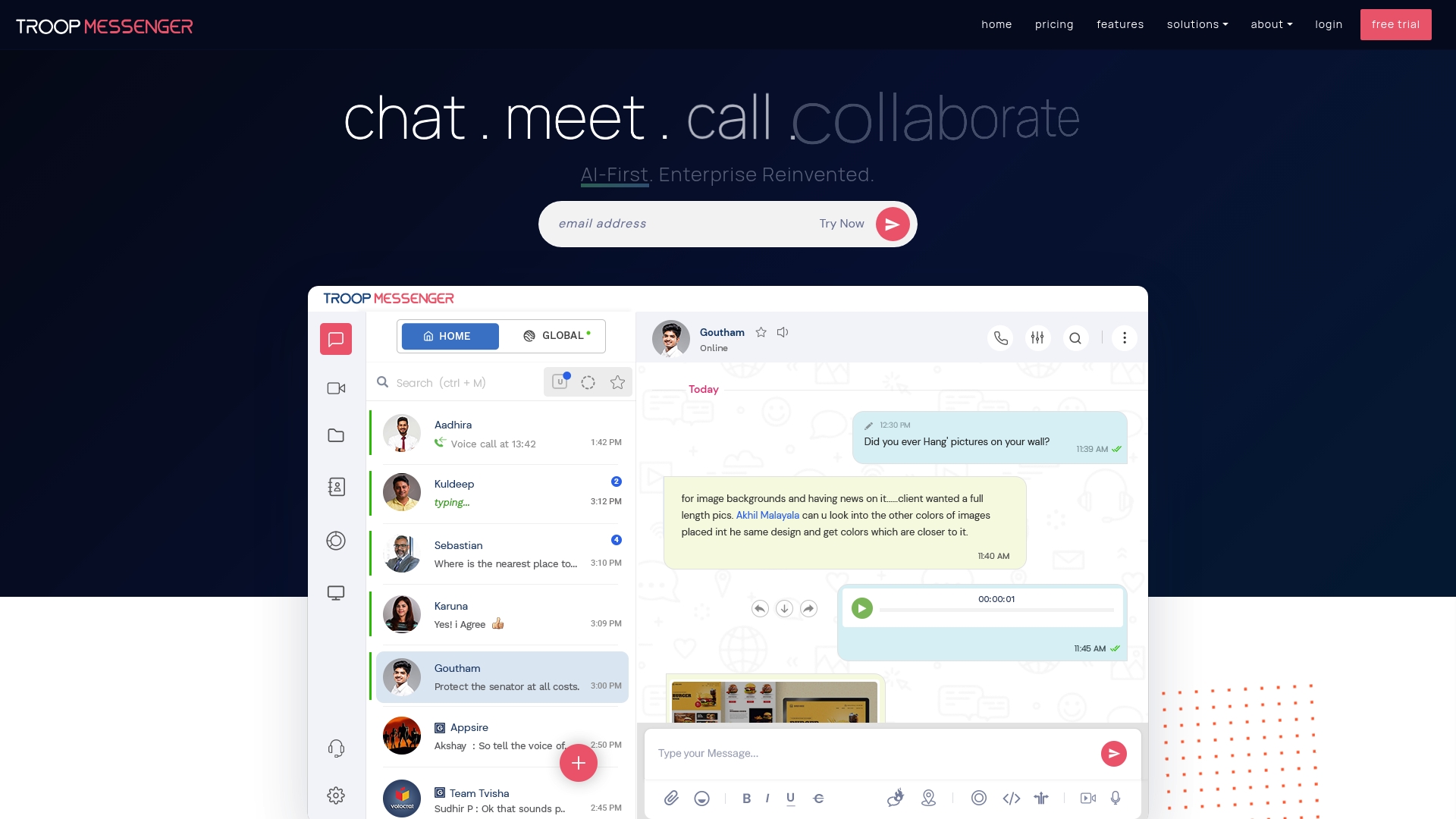 | Troop Messenger | End-to-end encryption <br> AI-driven productivity tools <br> Flexible deployments | Secure communication <br> AI supports multilingual teams <br> Scalable for enterprises | Pricing complexity <br> SaaS requires internet connectivity | Free tier available <br> Paid plans: $2.5/user/month for Premium, $5/user/month for Enterprise |